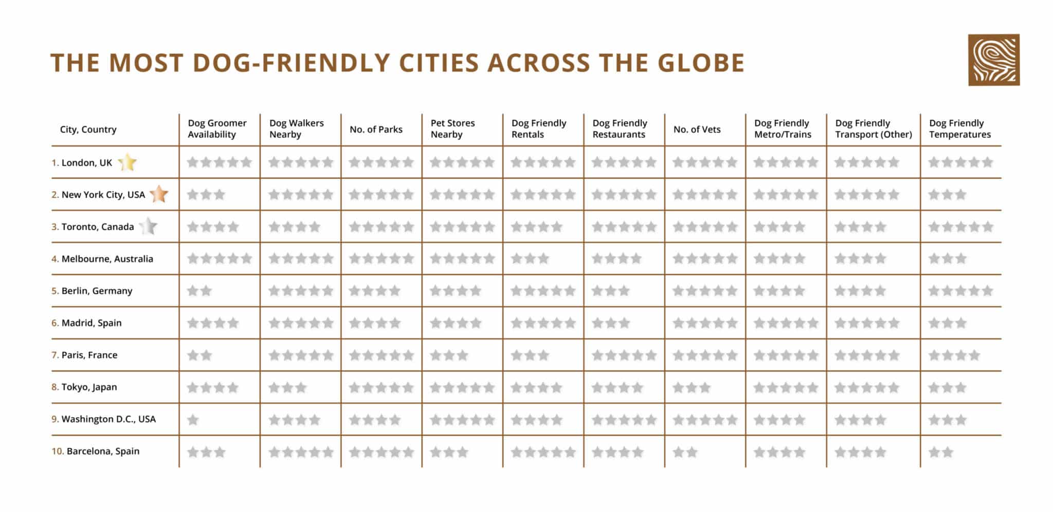 Overall, London ranks first as the top most dog-friendly city across the globe. After being assessed on several factors such as the number of parks, dog groomers and pet stores, London ranked first out of 85 of cities worldwide.